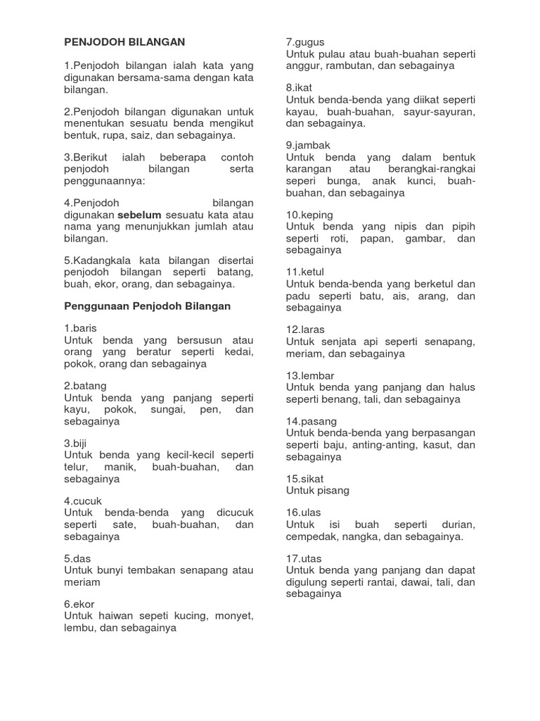 Pengertian bilangan bulat terdiri dari bilangan bulat negatif dan bilangan cacah Ibu membeli sesikat pisang di pasar. Senarai penjodoh bilangan, penggunaannya, dan contohnya adalah seperti yang berikut: Jangan salah guna penjodoh bilangan. Dua ____ pisau itu telah berkarat.