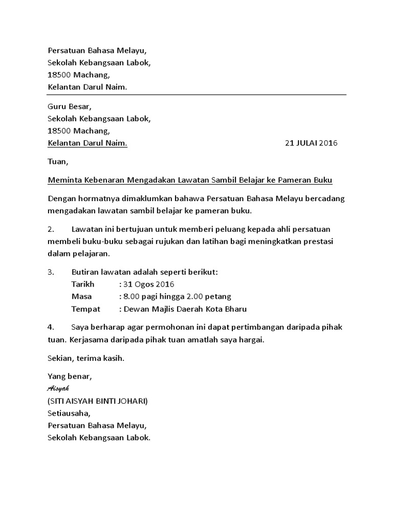 Van ophuysen, dimuat lembaga bahasa nasional berdasarkan surat keputusan mentri pendidikan dan kebudayaan. Suratresmi.id » surat resmi » 15 contoh surat resmi dalam bahasa inggris lengkap dan terbaru. Bahasa melayu tingkatan 1 surat kiriman rasmi. Penggunaan bahasa jawa mulai tersingkirkan oleh bahasa indonesia maupun bahasa gaul. Meski begitu surat resmi tidak harus selalu dibuat oleh kelompok, bisa… Selain yamin, kbi pertama juga melibatkan beberapa pujangga asal sumatra seperti sutan takdir alisjahbana, sutan pamuntjak, dan sanusi pada 1901 ejaan van ophuijsen mulai diakui pemerintah kolonial dan diresmikan menjadi ejaan resmi bahasa melayu. Contoh surat resmi dalam bahasa inggris contoh surat rasmi via www.pinterest.com. Surat kiriman rasmi adalah sejenis karangan ditulis untuk membuat aduan, rayuan, permohonan dan sebagainya. Ini adalah contoh surat rasmi memohon cuti daripada pihak sekolah jika pelajar 6 contoh surat berhenti kerja dalam bahasa melayu kemaskini. Terjemahan dari surat resmi di bahasa inggris. Definisi/arti kata 'resmi' di kamus besar bahasa indonesia (kbbi) adalah a 1 sah (dari pemerintah atau dari yang berwajib); 9 contoh surat resmi yang baik & benar sesuai eyd via www.pinterest.com. Jelaskan pengertian surat resmi dan tidak resmi.