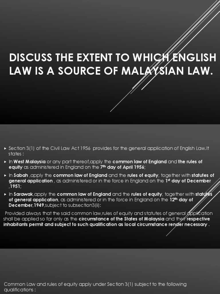 English law and it's application in malaysian court english law in virtue article 160 of federal constitution includes 'the common law in so far as it is in operation in the federation or any part thereof'. Malaysian legal system sources of law english law 1. The colonization of british in malaya has brought together the english law which later on became our country's source of law. This was a direct result of the colonisation of malaya, sarawak, and north borneo by britain between the early 19th century to 1960s. Common law, rules of equity and certain statutes) section 3 (1) of the civil law act 1956 (revised 1972) provides that, in peninsular malaysia, the court shall apply the common law of england and the rules of equity as administered in england on 7 april 1956. The debate on whether malaysia needs to sustain strong links with english law is likely to continue.irrespective of which side of the argument one may take, the truth is that malaysia s links with english law have contributed tremendously towards the development of the plural malaysian legal system which is highly regarded in the region. The english law can be divided into two which are the english commercial law and english land law. However, not all of england's common law and rules of equity form part of malaysian law. Section 3 (1) of the civil law act 1956 ( revised 1972) provides that, in peninsular malaysia, the courts shall apply the common law of england as well as equity as administered in england on april 1956. English law (common law and rules of equity) forms one of the sources of unwritten law in malaysia. Application of english common law in malaysia application of english common law in malaysia with reference to dershire county council times newspapers ltd ors studocu. Second was the spread of islam in the indigenous. Where the court decided to reject the english law completely or in part, and there being no written law in malaysia, the court is allowed to develop the malaysian common law and the court then is free to refer to 'any source of law, local or otherwise, be it england after 7 april 1956, principles of common law in other countries, islamic law.
