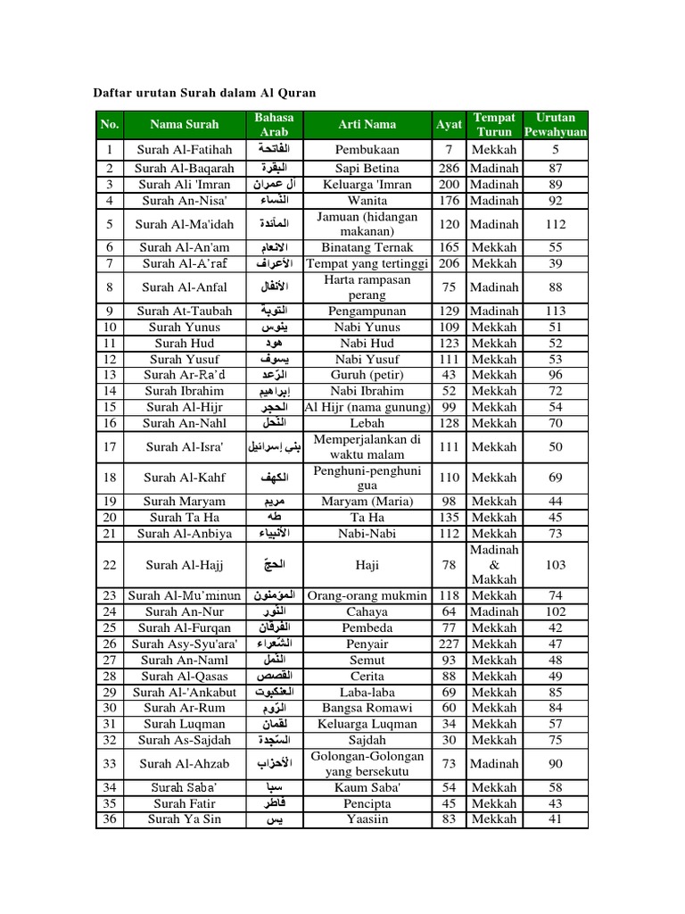 The real translation of the word ayat is actually sign of allah. Secara normal bagi manusia, maka urutan surat dan ayat yang ada di al qur'an memang terkesan tidak. 5,364 likes · 56 talking about this. Ia kisah adab, seorang anak terhadap seorang bapa. For a preliminary discussion about the chronological order of chapters see page surah. Pokok isi yang terkandung dalam surah al insyirah antara lain : List of surahs in quram with meanings in english. Al quran sudah diturunkan pada rasulullah saw yang bertujuan untuk membimbing seluruh umat islam agar selalu sabar dalam menjalani semua ketetapan yang sudah diberikan allah swt. Mendalam sungguh kasih allah pada rasulnya sejak baginda lahir lagi. Surah ali 'imran (keluarga imran) 4. Itulah daftar nama surah dalam alquran yang ditulis. Jumlah surah ada 114 surah terbagi menjadi 2 tempat. Lengkap dengan tafsir dan asbabun nuzul.